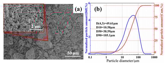 SEM photo (a) and particle size distribution (b) of the deep reduction product (leached).