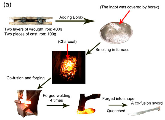 There were two main processes of steelmaking from cast iron: decarburization and co-fusion. The term “co-fusion” was first proposed by Joseph Needham in 1955; it corresponded to smelting carbon steel from the combination of cast iron and wrought iron [2]. Unlike modern wrought iron, the term “wrought iron” here meant that the carbon content of iron was too low to be steel, but it did not contain any information about the smelting technology. Co-fusion was mainly used to produce “edge steel” which was essential for making weapons and tools in ancient times, and it had excellent hardness and toughness. The research on the microstructures of swords is one of the hotpoint issues at present, and scholars have analyzed them all over the world [3,4]. Different cultures had significant differences in the processes of smelting swords’ steel in ancient times such as the “Wootz” process in India and Sri-Lanka [5,6] and the “Bulat” process in Central Asia [7,8,9] to smelt crucible steel, the “Zuku-oshi” process to smelt cast iron, and the “Kera-oshi” process to smelt crude steel in Japan [10]. There is no report on the production of steel by smelting cast iron with wrought iron, and co-fusion is represents this process. However, the technical details of the co-fusion process have been lost, and the microstructural characteristics of the co-fusion samples have not evident until now.
