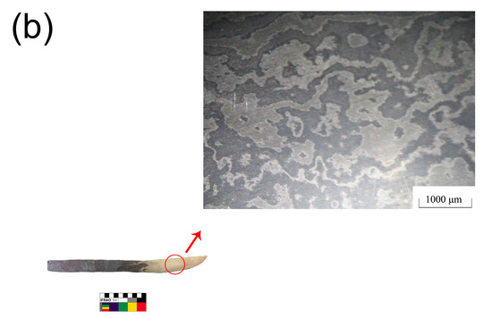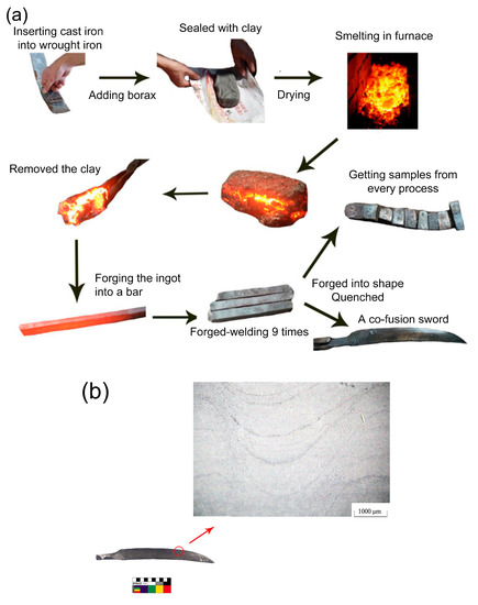 The first category was the final products such as swords and tools. Iron artifacts in References [14,15,17] fell into this category. An evident laminated phenomenon in these samples could be observed, and the carbon diffusion between the layers existed. These artifacts were forged into shape, but the quality was only on an average level. Therefore, they could not represent high-quality co-fusion products.