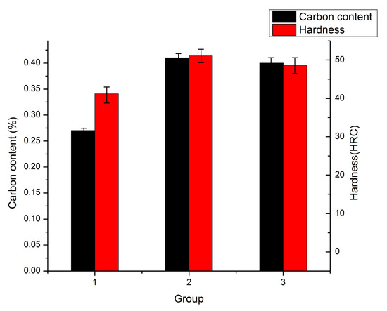 The carbon content and hardness were analyzed in each process of Group 3. The results are shown in Table 2.