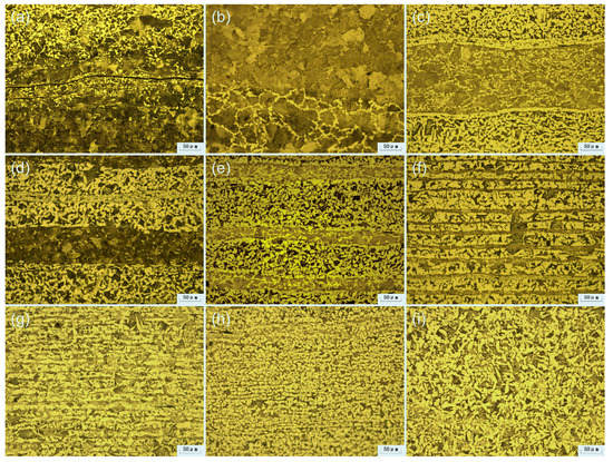 After forge welding for several times, the co-fusion samples would show a state of uniform lamination. Compared with the initial state, this lamination was mainly composed of high carbon layers and low carbon layers, as shown in Figure 5 and Figure 6, and there was no residual cast iron microstructure observed. The microstructure in the layers was different after forging, which was directly related to the proportion of materials before smelting.