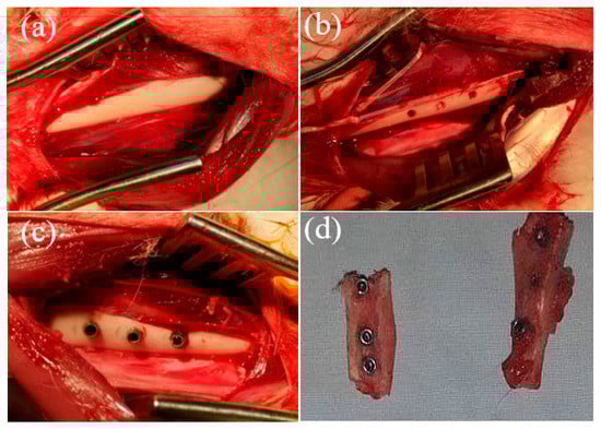 Surgical procedures showing (a) incision and peeling; (b) preparation of implantation sites using a guide drill and twist drill; (c) implant replacement where Ti64/SA implants were placed on the right side, while Ti64/7 ion implants were placed in the left side; and (d) the scarified sample taken after 8 weeks of the experiments.