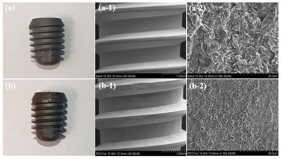 The appearance and SEM images of the Ti-6Al-4V alloy implants treated via (a,a-1,a-2) sand blasting and (b,b-1,b-2) plasma electrolytic oxidation (PEO) in a solution containing ions of seven elements.
