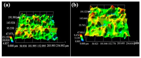 Figure 2 shows the SEM images of the Ti64/SA and Ti64/7 ion implants. The Ti64/SA implants were characterized by a rough surface characterized by irregular cavities uniformly alternated with peaks and valleys (Figure 2a-2). The surface of Ti64/7 ion implants exhibited a porous structure with different characteristics in terms of the shape and size of pores (Figure 2b-2). The mean pore size and porosity in the surface of Ti64/7 ion implants were measured to be 1.13 ± 0.4 μm and 9.98 ± 1.1%, respectively. The pores are ascribed to the presence of different ions in the electrolyte during PEO which can affect the gas evolution during PEO coating [25]. The presence of small particles on the Ti64/7 ion implants suggested the inclusion of electrolyte species, namely, Ca, P, Zn, Mg, Mn, Sr, and Si into the oxide layer during PEO. As displayed in Figure 3, the Ti64/7 ion implants exhibited lower roughness value with an average value of mean surface roughness (Ra = 1.43 ± 0.40 µm) as compared to the Ti64/SA implant, which showed a rougher surface with a value of (Ra = 1.61 ± 0.60 µm). The thickness of the oxide layer formed on the Ti64/7 ion implant was found to be ~3 μm, as revealed by the cross-section image shown in Figure 4a.