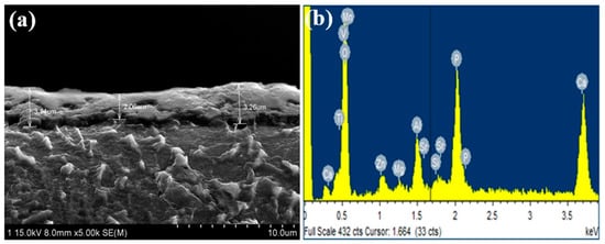 (a) Cross-sectional image of the Ti64/7 ion implant; (b) EDS area spectrum for the Ti64/7 ion implant. Ca, P, O, Ti, V, Al, Si, Mn, Mg, Sr, and Zn were identified.