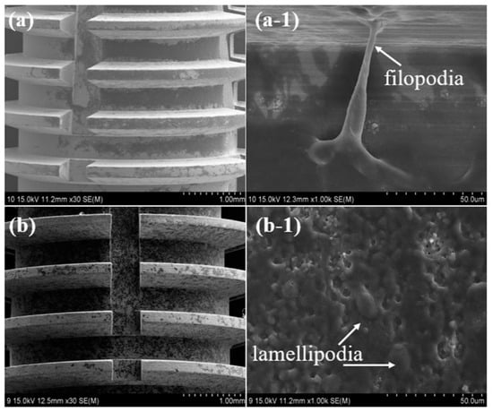 Figure 5 shows the SEM images of MC3T3-E1 cells cultured on the surface of Ti64/SA and Ti64/7 ion implants. Cells show the spinning form of filopodia (Ti64/SA implants) in lamellipodia (Ti64/7 ion implants) and grow in association with the cells. As can be seen from Figure 5b-1, the circular-type lamellipodia are noted near the pores as displayed in Figure 5b. Moreover, cell growth is actively found through interconnection with cells when compared with the Ti64/SA implants, as shown in Figure 5a.