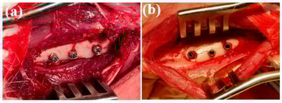 Twelve adult male rabbits weighing 2 kg were utilized in the present work. To identify the effectiveness of PEO-treated Ti alloys on the bone adhesion at the surface of dental implants, implants were separated into two groups: the first group was a control group (C.G) which includes the sand-blasted dental implants(Ti64/SA) (diameter: 2.9 mm, length: 7 mm, 36 implants), while the second group was the experimental group (E.G) which consists of PEO-treated dental implants (Ti64/7 ions) (diameter: 2.9 mm, length: 7 mm, 36 implants). All surgical operations were conducted under sterile conditions where autoclave sterilization was performed for all surgical procedures related to animal experiments one day before the experiment. (121 °C. 15 pounds, 15 min). Then, the rabbits were weighed, and 3 mL of Zoletil (Zoletil50, Virbac Co, Carros, France) per kg was injected intramuscularly into the thigh to induce sedation and anesthesia. The rabbit was placed in the prone position and shaved on both tibias. To disinfect the surgical site, a povidone iodine, chlorhexidine gluconate solution, and isopropanol were used. For local anesthesia at the surgical sites, 100,000 invasive anesthesia was performed using lidocaine containing epinephrine. The incision was carried out using 15 blades and exfoliation of subcutaneous tissue and periosteum, exposing both tibias, as shown in Figure 1a.