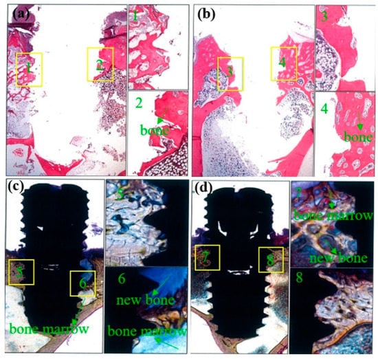 The visual observations were as follows. When the implants were detached and the implants were observed, the fluctuations of all implant fixtures were hardly observed. The formation of inflammatory and granulation tissues around the implant fixture was not observed, and an almost smooth bone surface was confirmed. Figure 6 shows the tissue photograph eight weeks after implantation of the Ti64/SA and Ti64/7 ion implants, respectively. Eight weeks after implantation, there were no signs of inflammation at the bone–implant interface where all implants in both groups were histologically in direct contact with the surrounding cortical bone (red color) and bone marrow (gray color part) along existed implant threads, as shown in Figure 7a,b, after removing the implant from bone. Interestingly, the amount of newly formed bone (blue color) around the surface of the experimental group (Ti64/7 ions) was higher than those in those around the experimental groups (Ti64/SA), as shown in Figure 7c,d. However, in both groups, the bone fixation of the implant fixture was similarly high. From the results of histomorphometric analysis listed in Table 2, the ratio of new bone created nearby the implant fixture was more than doubled in the experimental group (Ti64/7 ions) in comparison to the control group (Ti64/SA implants) (p = 0.029). As reported earlier [30], the bone formation would have originated from the implant surface properties, namely, chemical and physical design, which is referred to as “contact osteogenesis”, as well as from the bony margin of the surgical defect, i.e., “distance osteogenesis”. Therefore, we thought that the porous structure containing bioactive elements would be responsible for the higher amounts of bone formed in the case of Ti64/7 ion implants. However, there was no considerable difference between implant types in the values of BIC% (~69.3 for Ti64/SA implants vs. ~69.0 for Ti64/7 ion implants). This result was consistent with those obtained by He et al. [31] and Zhang et al. [32], who found that the incorporation of bioactive elements, such as Zn or Mg or Sr, into titanium implants would accelerate the surrounding bone formation and improve the amount of new bone formation in the rabbit model of osteoporosis. As such, Fernández-Yagüe et al. [33] found that the bioactive implants produced by plasma or thermochemical processes would exhibit more new bone formation when compared to the non-bioactive implants treated by shot blasting and acid etching. Furthermore, Aparicio et al. [34] demonstrated that the created microroughness by Al2O3 grit blasting accelerated in vitro apatite nucleation on alkali- and heat-treated titanium plates.