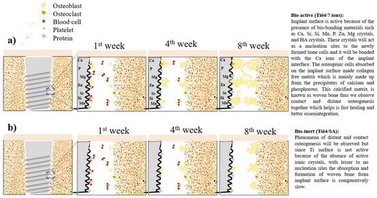 Surface roughness, hydrophilicity, and surface activity of implants increase the bone healing response. Its higher reverse torque value and histomorphometric analysis suggest a quicker healing rate. On the basis of this, we propose that the bone formation shows contact osteogenesis and distant osteogenesis at a faster pace, as shown in Figure 8a, compared to its counterpart shown in Figure 8b. The faster bone response was attributed to the active ionic crystals which provided nucleation sites to the newly formed bone cells, and these bone cells find it easier to bond with the calcium and phosphorous ions of the implant interface. One of the main advantages of activating the interfacial surface with activating ions over the simple sand-blasting sample is the obtention of a better bone response in bodies that show a difficult healing response. This is because the bone formation in different patients of diabetes, cancers, and patients of radiotherapy is very slow; for a simple Ti-implant to complete osseointegration, 8–16 months are required; and in some cases, it is considerably challenging. Thus, the surface modification and incorporating these active seven ions will provide the active surface where the distant osteogenesis and contact osteogenesis rate will speed up, and, thus, we experience higher bone formation.