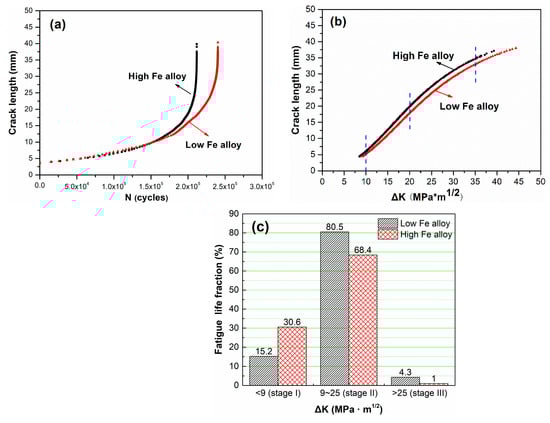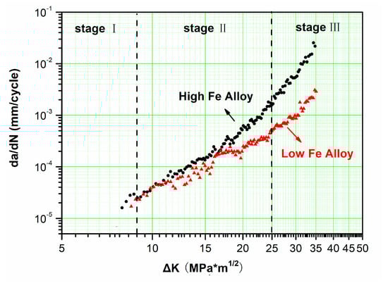 - Compared to the alloy with a high Fe content level, the alloy with a low Fe content level exhibits a higher ultimate tensile strength, tensile yield strength, and elongation. Especially when ∆K is 33 MPa⋅m1/2, the FCG rate decreases by 20%. Moreover, the alloy with a low Fe content level (2A97-T3) exhibited a lower density, accompanying equivalent tensile strength and FCG rate compared to damage-tolerant 2524-T3 alloy.