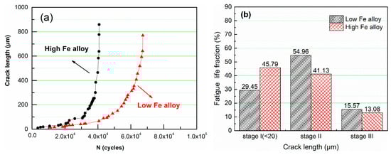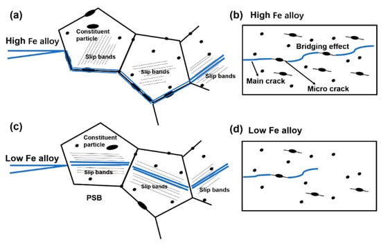- It is postulated here that the micro-cracks formed around the coarse Fe-containing particles are merged with the primary crack to produce a bridging effect, accelerating the growth of fatigue crack in the alloy with a high level of Fe content.