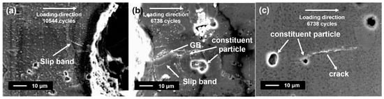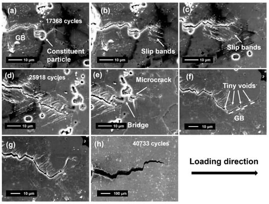 - Cauthen, C.; Anderson, K.V.; Avery, D.Z.; Baker, A.; Williamson, C.J.; Daniewicz, S.R.; Jordon, J.B. Fatigue Crack Nucleation and Microstructurally Small Crack Growth Mechanisms in High Strength Aluminum Alloys. Int. J. Fatigue 2020, 140, 105790. [Google Scholar] [CrossRef]