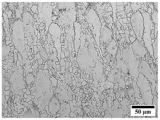 The material used for this investigation was ZK60-T5 magnesium extrusion. The material was acquired from SMW Engineering, Russia, as 1000 mm rods with a diameter of 150 mm. This alloy has chemical compositions as listed in Table 1. The microstructure of the material of the plane normal to the extrusion is shown in Figure 1. This microstructure was observed by cutting small metallurgical samples that were mounted and then polished using 240, 320, 400, and 600 grit size abrasive papers. An etchant was prepared using 5 g picric and 5 mL acetic acid, 10 mL distilled water, and 100 mL ethanol. After etching the samples, the micrographs were taken using an Olympus DSX-510 digital microscope. The microstructure consists of large and small grains with an average grain size of 9.52 µm ± 1.89 µm. This structure is commonly observed in ZK60, investigated elsewhere [46], and in other wrought magnesium alloys, such as AZ31B [47,48], AZ61A [49], and AZ80 [50].