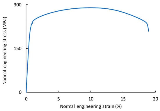 A representative monotonic tensile stress–strain curve for the material is shown in Figure 2. According to Figure 2, the material exhibits conventional power-type hardening. This is expected because it is known that slipping is the major plastic deformation mechanism when tensile loading is applied parallel to the extrusion direction [24]. Loading that is oriented such that extension is caused along the c-axis produces () tension twins that have a low critical resolved shear stress value. This effect can be observed when a specimen that is machined along the working direction is subjected to compressive loading. In this case, the resulting stress–strain curve shows a sigmoidal-type behavior. By contrast, application of tensile loading on a specimen machined along the working direction only activates slipping mechanisms. Therefore, the tensile stress–strain curve for such a case shows conventional, power-hardening-type behavior [15]. Among the different slip systems in magnesium, such as () prismatic, and pyramidal () and (), the basal () has the lowest critical resolved shear stress. It was observed that basal planes can only accommodate about 8% elongation if they are tilted toward the loading axis by more than 16.5° [51]. Additional elongation reaching 20% can be obtained when the () prismatic becomes dominant [51]. The ratio of the critical resolved shear stress of prismatic to basal slip is estimated to be between 1.5 and 2.5 [52,53].