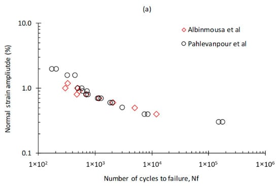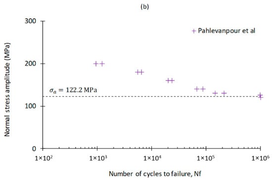 The cyclic behavior of the material has been investigated under strain-controlled axial, shear, and multiaxial cyclic loading conditions [54]. This alloy has also been tested under uniaxial strain-controlled fatigue loading by Pahlevanpour et al. [36,55]. Figure 3a indicates that the strain–life curves obtained by Albinmousa et al. [54] and Pahlevanpour et al. [36,55] are significantly comparable. Therefore, the stress–life curve obtained by Pahlevanpour et al. [34,55], shown in Figure 3b, was used for this investigation. In general, the cyclic behavior of ZK60 magnesium extrusion is similar to other wrought magnesium, such as AZ31B [15,48], AZ61 [49], AM30 [26], and AZ80 [50]. The development of strong texture as a result of either the extrusion, rolling, or forging process causes the material to exhibit tension–compression asymmetry due to slipping in tension reversal and twinning in compression reversal. A sigmoidal-type behavior is usually observed in the tension reversal as twinned lattices are detwinned after compression. While such a distinct behavior is commonly observed in cyclic strain-controlled experiments, it also prevails under cyclic stress-controlled loading when local strain is measured by an extensometer [34] or digital image correlation [56].