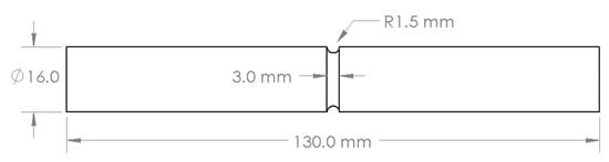 Fatigue experiments were performed on notched ZK60-T5 specimens. Blanks with an 18 mm × 18 mm cross section and a length of 140 mm were cut along the extrusion direction of the rod. These blanks were then machined to round specimens with a diameter of 16 mm and length of 130 mm. U-notches were machined in the middle of the specimens with a depth of 1.5 mm and a radius of 1.5 mm, as shown in Figure 4. Completely reversed stress-controlled cyclic axial experiments, , were performed on six U-notched specimens. The notched specimens were subjected to force amplitudes between 16 and 11.5 kN corresponding to nominal stress amplitudes of 57.2 and 79.6 MPa at the gripping section, respectively. These amplitudes resulted in a fatigue life range between nearly 104 and 106 cycles. Frequencies between 1.0 and 30 Hz were used for the experiments. All specimens were loaded until complete fracture by separation.