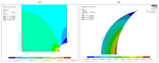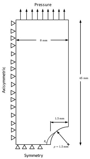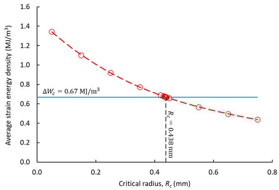 For a U-notched specimen with , Equation (4) yields , as indicated in Figure 5. Based on the strain energy density criterion, the critical radius is considered a material property [61]. If all required variables are known, the critical radius can be determined using Equation (3). However, a more convenient procedure can be followed to determine the critical radius using finite element analysis, which is explained in the next section.