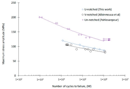 The fatigue results for U-notched specimens obtained in this investigation are listed in Table 2. In addition, the results for V-notched specimens obtained by Albinmousa et al. [37] are also listed in the table for comparison. The nominal and net section stresses in the table are calculated at the gripping, mm, and net, mm, sections, respectively.