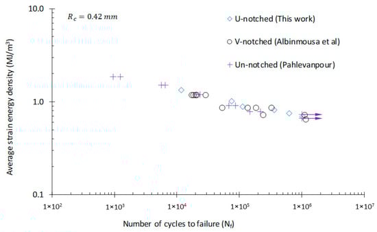It is seen from Table 2 that more duplicates were tested using V-notched than U-notched specimens given more confidence in the value of the critical radius obtained using the results of V-notched specimens, although a difference of 4.2% is negligible. In addition, to have a common background for comparison, a single value of the critical radius, mm, was used for evaluating the average strain energy density for both the U- and the V-notched specimens. Figure 10 shows the correlation between the strain energy density and fatigue life of unnotched and U- and V-notched specimens using a power-type equation with an R2 = 0.972. It is evident from this figure that the strain energy density (SDE) criterion can correlate the data from all specimens into a single and narrow scatter band. It is important to note that the strain energy densities for unnotched specimens were evaluated using Equation (1). On the other hand, the strain energy densities for all notched specimens were averaged over the control volumes for each specimen.
