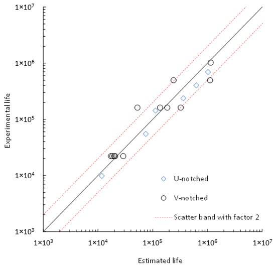 The strain energy density approach explained in Section 3 offers a simpler and more practical alternative with a promising reliability, as observed in Figure 10. To estimate the fatigue life of the U- and V-notched specimens examined in this work, the energy–life data for unnotched specimens were fitted with a power-type equation as shown in Figure 11. After that, the energy–life equation obtained was used to estimate the cyclic axial fatigue lives of U- and V-notched specimens. A comparison between experimental and estimated fatigue lives of all notched specimens is shown in Figure 12. This figure shows that estimations fall within 2x scatter bands, which clearly supports the capability of the strain energy density criterion in estimating the fatigue lives of different ZK60 notched geometries.
