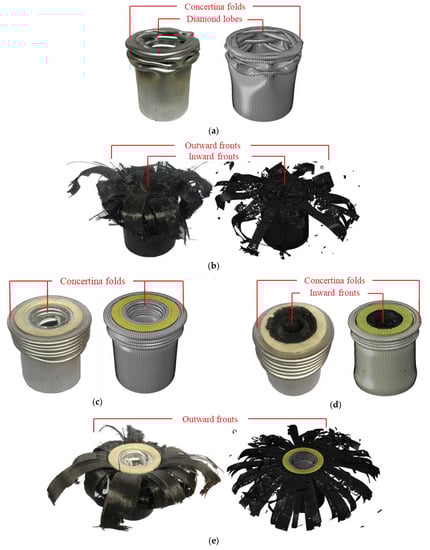 Figure 5a,b show the deformation modes and load–displacement curves of the inner aluminum tube (AL-I) and the outer aluminum tube (AL-O), respectively. For AL-I, there were typical concertina modes during the first two deformation process, so it exhibited good stability, and the force was regular and repeatable with crushing displacement changes. However, the deformation mode changed to diamond mode when the crushing displacement reached about 33 mm, the tube wall did not fold completely inward; sharp corners were formed on the opposite side and appeared alternately, so the stability of the deformation process became bad and the force obviously decreased. Finally, the AL-I formed a mixed deformation mode.