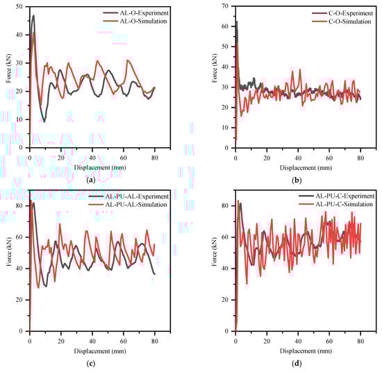 Comparison of force–displacement curves between the experimental results and simulation results: (a) AL-O; (b) C-O; (c) AL-PU-AL; (d) AL-PU-C; (e) C-PU-AL; (f) C-PU-C.