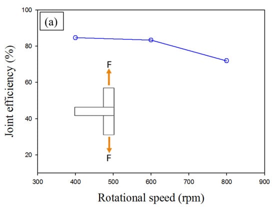 It can be noted that or the joint welded at 800 rpm the joint efficiency along the skin direction is the lowest and for the stringer direction is the highest as shown in Figure 18a,b can be due to two reasons. First, the reduction in the hardness relative to the other two revolution speeds as shown in Figure 7, due to the increased heat input. Second, the reduced skin thickness due to the pressing effect of the shoulder (Figure 5), this is not the case for tension in the stinger direction. Moreover, at 800 rpm the pressing by the shoulder and the increased softening has generated larger fillet than the other two lower rotation speeds (400 and 600 rpm). This large fillet represents more support for the stringer leading to the highest joint efficiency.