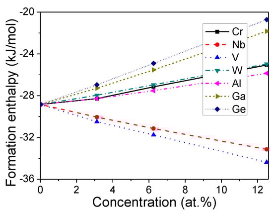 These formation enthalpies of doped Mo3Si are negative, suggesting that doped Mo3Si with a Pm-3n structure is stable at the investigated low-doping concentration (≤12.5 at.%). This work investigated the alloying effects of different elements under low-doping concentrations (≤12.5 at.%) on Mo3Si.
