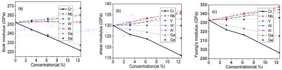Mechanical properties of doped Mo3Si. (a) bulk modulus; (b) shear modulus; (c) Young’s modulus.