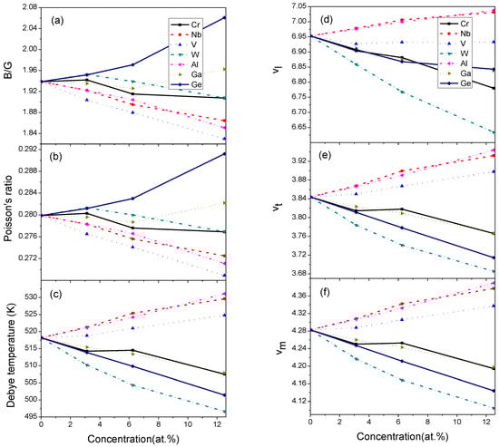 The alloy’s ductility or brittleness can be evaluated by B/G and [35]. Figure 4 shows the B/G and of alloyed Mo3Si. The B/G and of undoped Mo3Si are higher than 1.75 and 0.26, respectively, suggesting that the ductility of Mo3Si is not low. The B/G and of Mo3Si decrease with increasing V, Al, and Nb, and increase with the increasing Ge. The effect of Cr, W, and Ga on the B/G and of Mo3Si is relatively small. It is suggested that V-, Al-, and Nb-doping can form strong covalent bonds, and decrease shear deformation and alloy ductility. Rosales [7] proposed that Nb should strengthen the solid solution and reduce the toughness of Mo3Si, which is in line with our calculations.