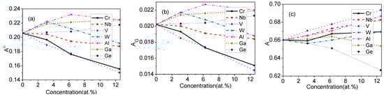 According to Equation (3), the of doped Mo3Si is zero, suggesting that the bulk modulus is elastically isotropic. Figure 5 shows the mechanical anisotropic indexes, , , and of doped Mo3Si. It is seen that the shear modulus exhibits strong directional dependence. The percent anisotropy of the shear modulus decreases by Mo-site doping (Cr, Nb, and V), but increases by Si-site doping (Al, Ga, and Ge). The of W-doped Mo3Si increases slightly at relatively low concentrations (≤6.25 at.%), but decreases at high concentrations (12.5 at.%). The Zener’s shear anisotropy index increases by Mo-site doping (Cr, Nb, and V) and Al-doping, but decreases by Ge-doping obviously. The of W-doped Mo3Si shows a fluctuation, which is similar to the situation of .