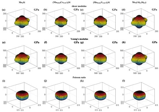 According to Equation (6), the bulk modulus is elastically isotropic. Combined with Equations (3) and (6), the shear modulus and Poisson ratio at different directions can also be calculated using spherical coordinates. Moreover, the calculation formula of the shear modulus and Poisson ratio for a cubic structure can also be referred in Refs. [33,39]. Figure 6 shows the 3D surfaces of the shear modulus, Young’s modulus and Poisson ratio for Mo3Si alloyed with 12.5 at.% Cr, V, and Al. These surfaces of Cr- and V-doped Mo3Si are different from those of undoped Mo3Si, showing the significant effect of Cr and V on elastic anisotropy. The anisotropy of shear and Young’s modulus for Mo3Si doped with Al strengthens slightly. The calculations also show that the 3D contours of the Poisson ratio for doped Mo3Si are very close to those of undoped Mo3Si, suggesting that the effect of doping with the alloying elements on the anisotropy of Poisson ratio is small.