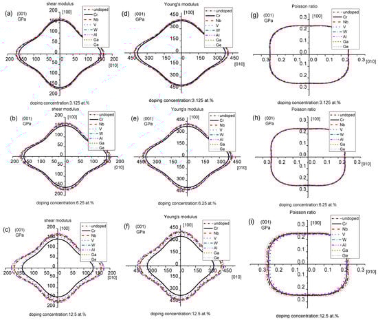 Two-dimensional projections of the shear modulus, Young’s modulus and Poisson ratio for undoped and doped Mo3Si. (a–c) Shear modulus; (d–f) Young’s modulus; (g–i) Poisson ratio.