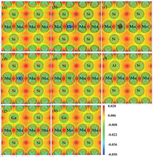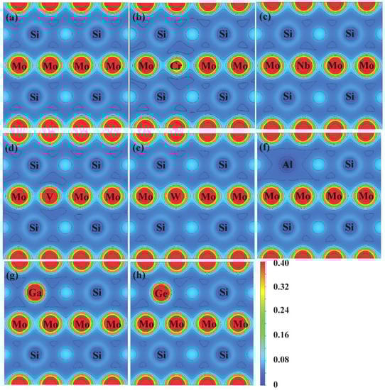 Charge densities of undoped and doped Mo3Si. (a) undoped; (b) Cr; (c) Nb; (d) V; (e) W; (f) Al; (g) Ga; (h) Ge.