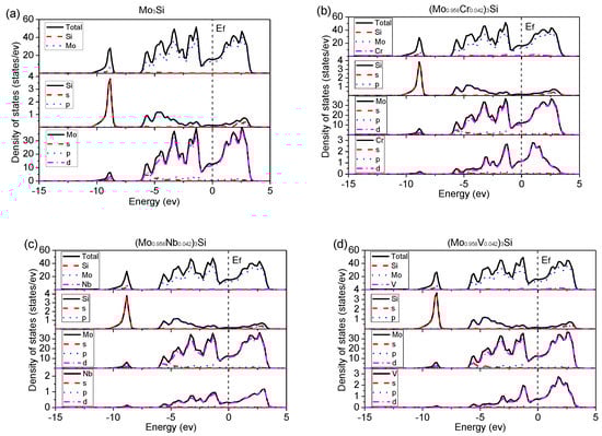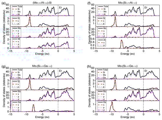 Figure 10 shows the density of states (DOS) of undoped and doped Mo3Si with alloying elements. In Figure 10a, there is no gap and non-zero DOS at the Fermi level for undoped Mo3Si, which shows its metallic behaviors. Furthermore, there is an overlap between Mo-4d and Si-3p for undoped Mo3Si. Two peaks are divided by the Femi level called the pseudogap. These phenomena suggest a strong covalent bonding between Si and Mo, consistent with the above charge results. The same situations also occur in doped Mo3Si, suggesting strong covalent bonding caused by the d-p hybridization between Mo-site atoms (Mo, Cr, Nb, V, and W) and Si-site atoms (Si, Al, Ga, and Ge).