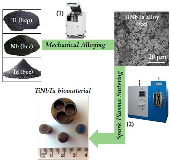The new potential TiNbTa material was developed from the elemental Ti, Nb, and Ta powder transition metals as raw materials using a Powder Metallurgy route, including the mechanical alloying (MA) and subsequent consolidation of the as-synthesized TiNbTa alloy by spark plasma sintering (SPS). A schema of the route used is displayed in Figure 1.