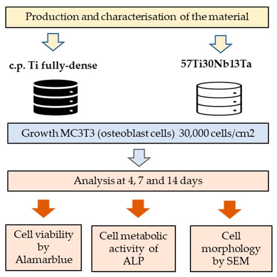 Diagram of in vitro experimental design. Osteoblast cell line (MC3T3E1) was used to analyze the biological response to fully dense Ti c.p. vs. TiNbTa samples.
