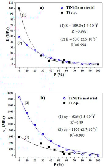 On the other hand, the elastic modulus (E) and the yield strength (σy) for porous TiNbTa materials, with porosities from 10 up to 90 vol %, were estimated from the E and σy values corresponding to the fully dense TiNbTa presented and the empirical Mondal equation [29].