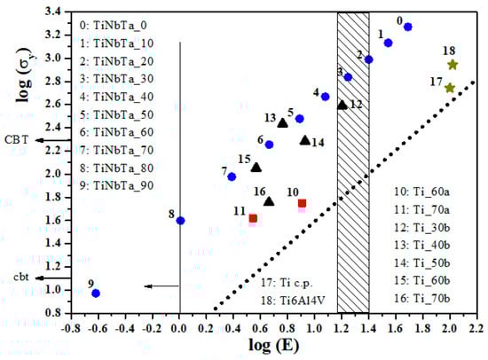 Subsequently, Figure 4 shows the double logarithmic E-σy curves for the Ti c.p. and TiNbTa fully dense and foam materials. Moreover, the same values for the Ti6Al4V biomaterial and the interval values for the cortical and cancellous bone tissues were introduced for comparison purposes. It should be borne in mind that the main objective of this linearized figure is to maximize the index σy/E, that is, minimize the E and, consequently, diminish the potential detrimental “Stress-Shielding” phenomena of a possible implant fabricated with these materials, but with a maximization of the yield strength (σy), thereby avoiding the plastic deformation of the implant. Thus, after linearization, the index σy/E = C evolves to the line equation log σy = log (E) + log C. Using a line with a slope equal to 1 (marked in Figure 4 as a dotted line), it is possible to maximize the ordinate at the origin (log (C)), and, therefore the index C = σy/E, as desired. With this reasoning, the specimens that optimize this index σy/E for the cortical bone are those named either TiNbTa_20 or TiNbTa_30, that is, the TiNbTa foams with 20 and 30 vol % of porosity, respectively. This assertion is in concordance with the optimized specimens selected attending to the relationship porosity-E and porosity-(σy) (TiNbTa_20 and TiNbTa_30) as determined in Figure 3. However, a higher amount of porosity (10% more) could be introduced for TiNbTa_30, thereby enabling improvements in the cells’ ingrowth to the implant without any detrimental effect on mechanical behavior; these last specimens could be accepted as the optimized materials for cortical bone tissue replacement. Furthermore, for both specimens, the yield strength obtained is sufficient in comparison with the maximum yield strength of the cortical bone tissue. It should be taken into consideration that, although the Ti_40b seems to have a higher σy/E = C than the cortical bone, its lower E value in comparison with the cortical bone could affect the mechanical behavior of the implant with a non-acceptable elastic deformation.