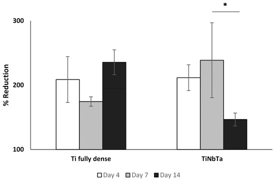 Cell viability of cultured cells from fully dense Ti or TiNbTa at 4, 7, and 14 days of cell growth. The results are presented as mean ± standard deviation, * p < 0.05.