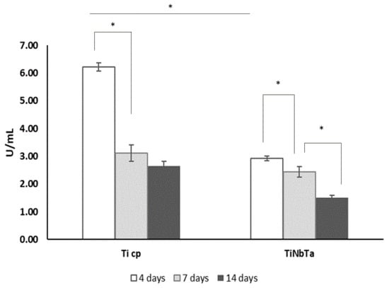 Figure 6 represents the alkaline phosphatase (ALP) activity values in MC3T3 cell cultures at 4, 7, and 14 days. In TiNbTa discs, a decrease in activity is also observed with the culture time, and there is a significant difference between days 4 and 7, and also between days 7 and 14 of culture (p < 0.001). In Ti c.p. discs, the results obtained show a decrease in enzyme activity, whereby the difference found between days 4 and 7 are statistically significant (p < 0.05). In both conditions, at 4 days, the maximum enzymatic activity is obtained since there is a greater proliferation and cell growth as the viability values corroborate. From day 7, the cells present a more differentiated phenotype as can be observed in the SEM images, and the ALP activity decreases.