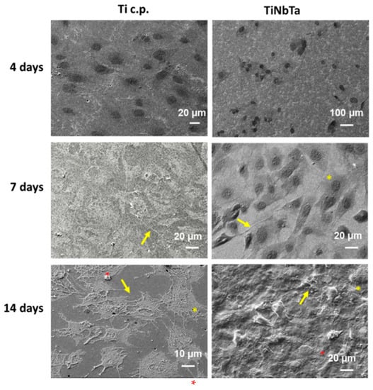 SEM micrographs at 4, 7, and 14 days of osteoblast culture growing on fully dense Ti c.p. or TiNbTa surface. Cell morphology and osteoblast proliferation are observed with filopodia marked by yellow arrows and lamellipodia indicated by yellow asterisks (flattened extension of a cell, by which it adheres to a surface). The small hexagonal-structure vesicles are indicated by a red asterisk, which suggests hydroxyapatite on the cell surface.