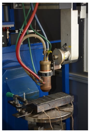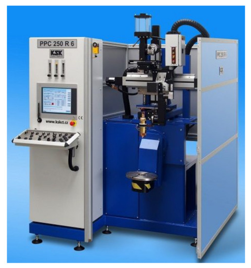 For hardfacing, Vanadis HSS 23, Vanadis HSS 30, and DEW Nibasit 625-P powders were used on the base material X38CrMoV5-1, and a plasma hardfacing machine (Figure 2 and Figure 3) PPC 250 R6 (KSK s.r.o., Česká Třebová, Czech Republic). This automatic hardfacing machine is designed for the hardfacing of rotating and nonrotating parts using the PTA method. Components can be hardfaced on the forehead or around their perimeter. The machine enables pulse hardfacing with a current of 50–250 A and a frequency of 0–200 Hz. The machine has a hardfacing part with a torch closed by a cover with a protective hardfacing glass. The machine burner is guided in four axes, X, Y, Z, and N, so that the feed is allowed in three axes with rotation of the whole system, while the positioner is controlled in two axes, C and R. The machine is equipped with a feeder of additional material in powder form to supply feed gas. The hardfacing machine can be operated manually or automatically using the programming console.