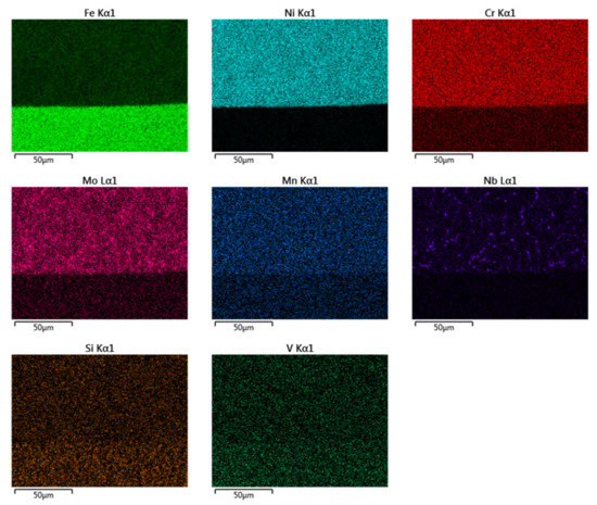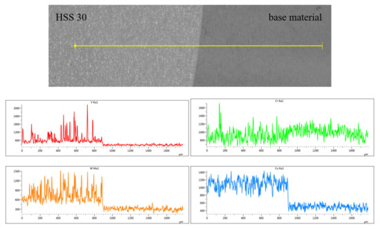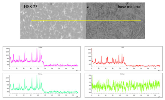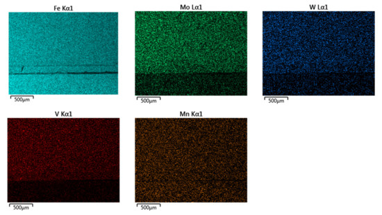 Figure 15 shows that the content of Fe and Mn in the base material and the hardfacing metal is the same: both elements are evenly distributed over the entire evaluated area. The elements Cr, Mo, V, and W are contained in a higher concentration in the hardfacing metal than in the base material.
