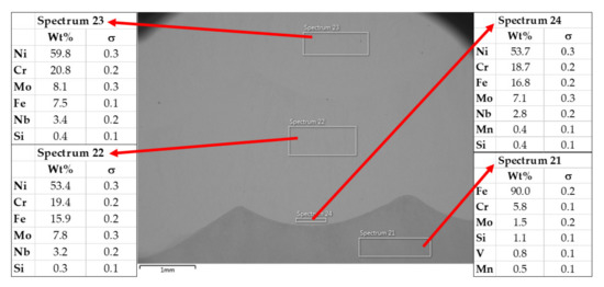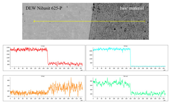 In the melting zone, the materials were also mixed, as evidenced in particular by the content of the elements W, V, and Mo, which lie between the base material and the hardfacing layer. Figure 20 shows the results of the DEW Nibasit 625-P hardfacing layer analysis.