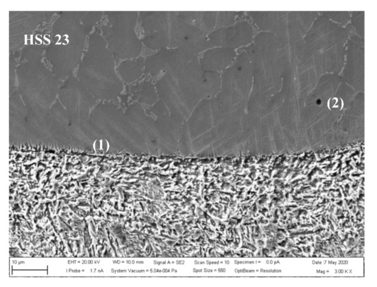The structure of the overlay metal HSS 30 is dendritic-cellular, similar to that identified by Saewe [40]. The distance of secondary dendrite arms depends on the cooling rate during solidification. The microstructure of the powder particles consists of martensite, retained austenite, and uniformly distributed fine carbides. Martensitic laths are present in the dark grains, described by Jovičevic-Klug [41]. A light phase is segregated along the grain boundaries.