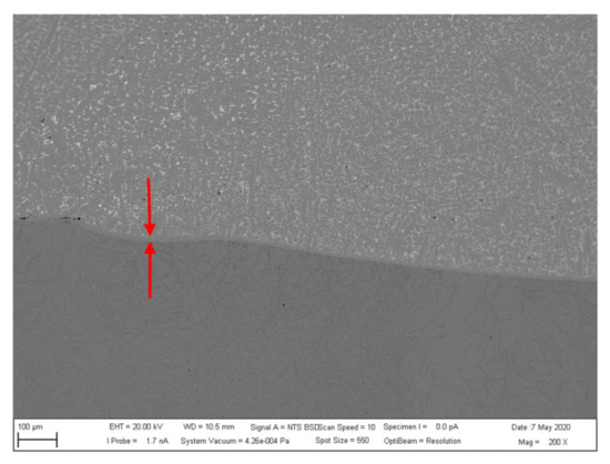 Figure 8 shows the connection of the hardfacing layer and the base material in the central part of the hardfaced material. The material connection does not show defects; there is a thin mixing zone at the interface (marked by arrows).