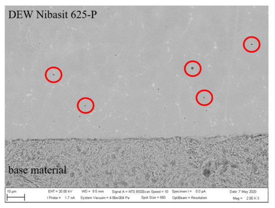 From Figure 6, it is apparent that the transition between hardface structure and base material is smooth. No “cold joints” are observed on the melting borderline of the base material. The presence of pores, eventually inclusions that were not detected, was seen on the metallographic sections. The microstructure of the alloy is dendritic-like, with a cubic face-centered structure and no phase transitions in the solid state. The strength properties of the hardfacing layers DEW Nibasit 625-P are increased by carbon, chromium, and molybdenum. The high strength is achieved by solid solution hardening (Mo and Nb) and by precipitation hardening, which is mainly derived from the metastable γ” phase (Ni3(Nb,Al,Ti)).