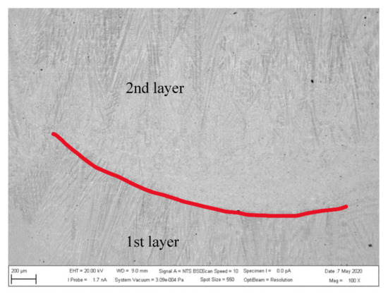 Figure 12 shows the hardfacing layer DEW Nibasit 625-P and the base material transiting area. In the base material melting line, no presence of inner defects or cracks was found. In the hardfacing layers, pores were detected. Their amount on the assessed metallurgic section did not exceed the limit values for the hardfacing metal. Figure 13 shows the transiting line between the first and the second hardfacing layers. The hardfacing metal solidification direction was well defined on the transition line.