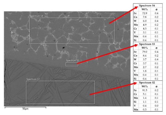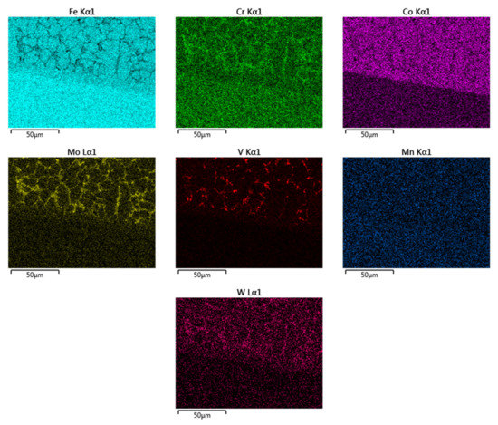 Figure 16 shows that the elements Cr, Mo, and V are concentrated in the eutectic phase between the grains, while Co is concentrated more in the martensitic grains.